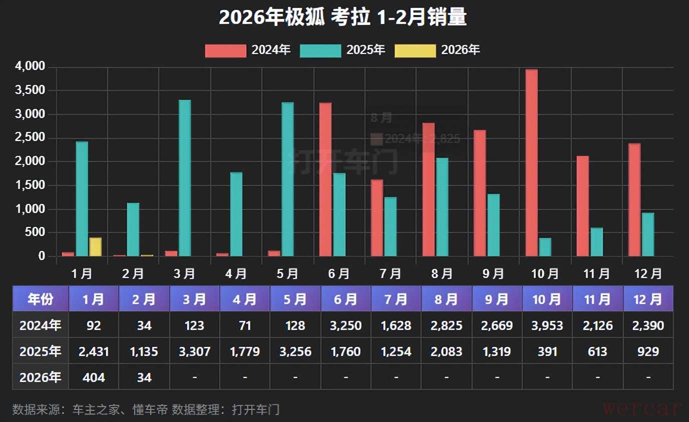 2月份,极狐考拉销量为34辆,同比减少97%,1-2月份,累计销量为438辆,累计同比减少87.72%。