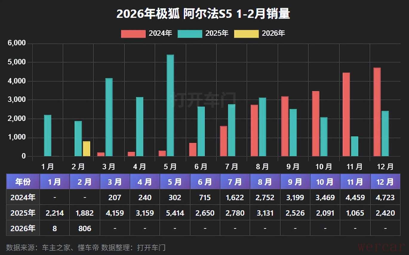 2月份,极狐阿尔法S5销量为806辆,同比减少57.17%,1-2月份,累计销量为814辆,累计同比减少80.13%。