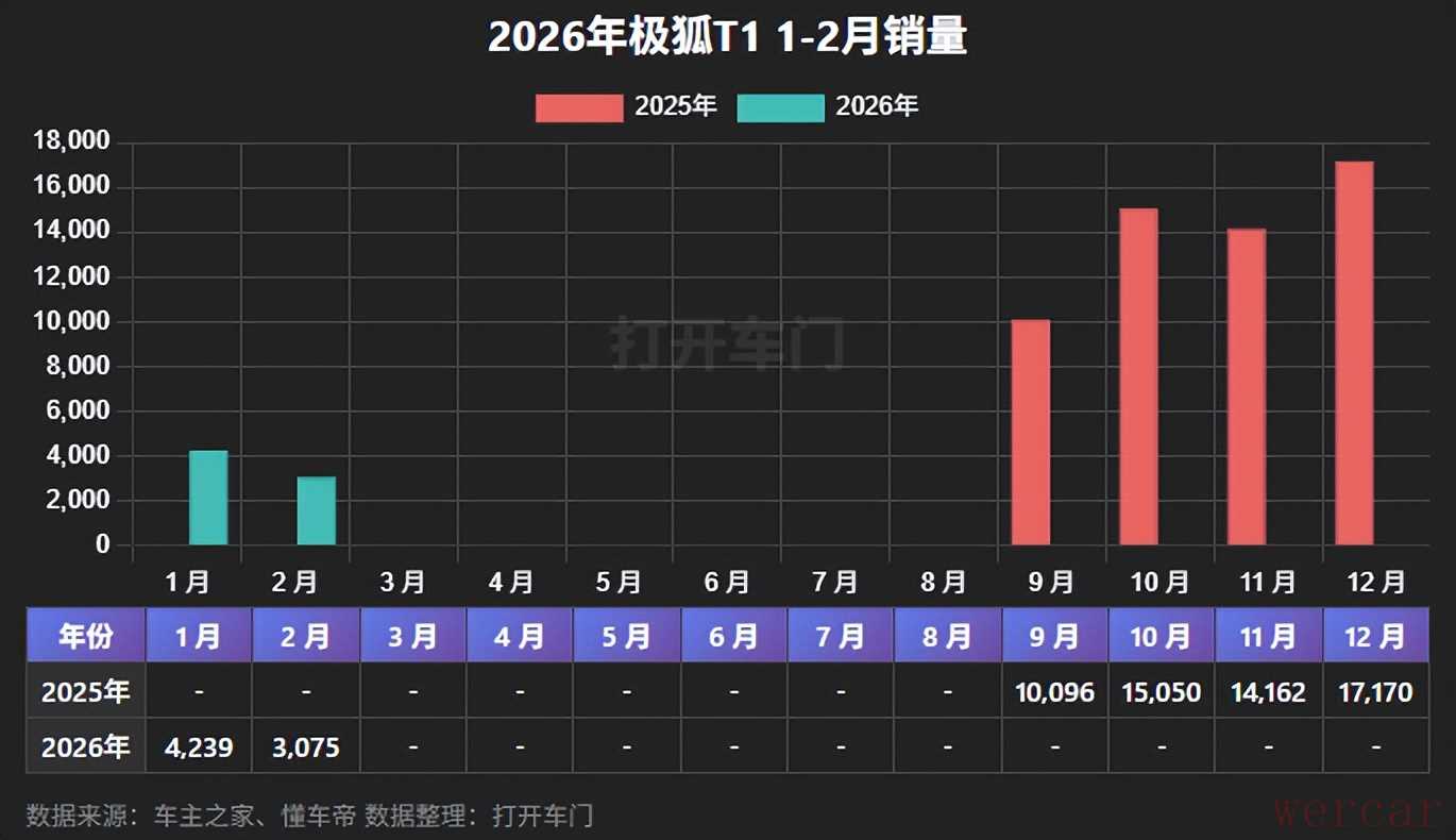 2月份,极狐T1销量为3,075辆。极狐T1定位小型SUV市场,于2025年9月11日上市。极狐T1上市后的销量表现亮眼,于2025年12月达到1.7万辆。极狐T1是极狐品牌战略下沉、寻求销量规模化的关键一步,竞争对手有比亚迪海鸥、吉利星愿、五菱缤果等车型。