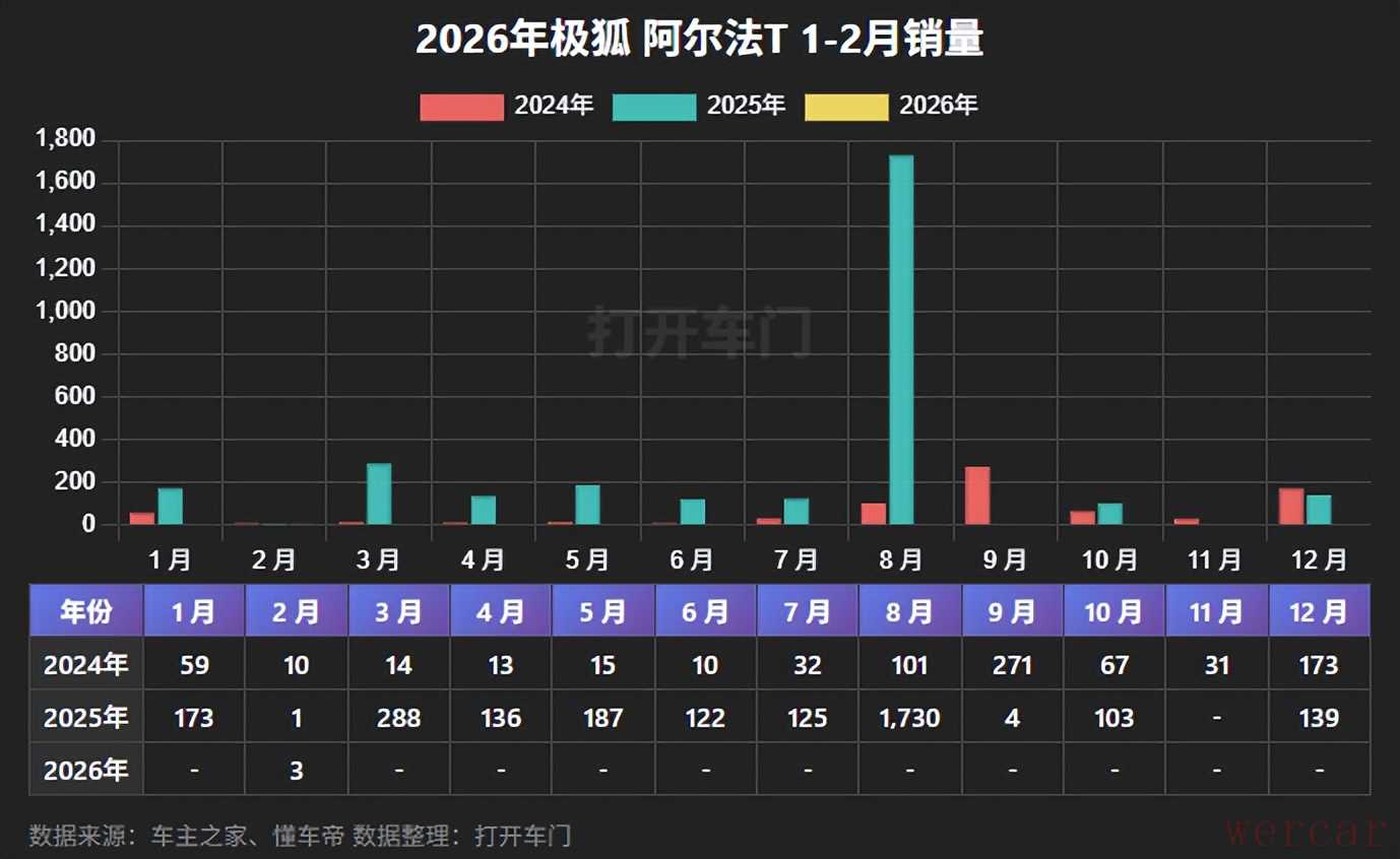 2月份,极狐阿尔法T销量为3辆,同比增长200.00%,1-2月份,累计销量为3辆,累计同比减少98.28%。