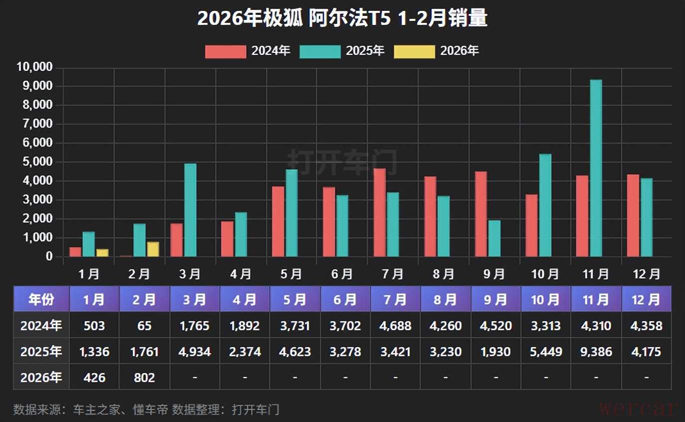 2月份,极狐阿尔法T5销量为802辆,同比减少54.46%,1-2月份,累计销量为1,228辆,累计同比减少60.35%。
