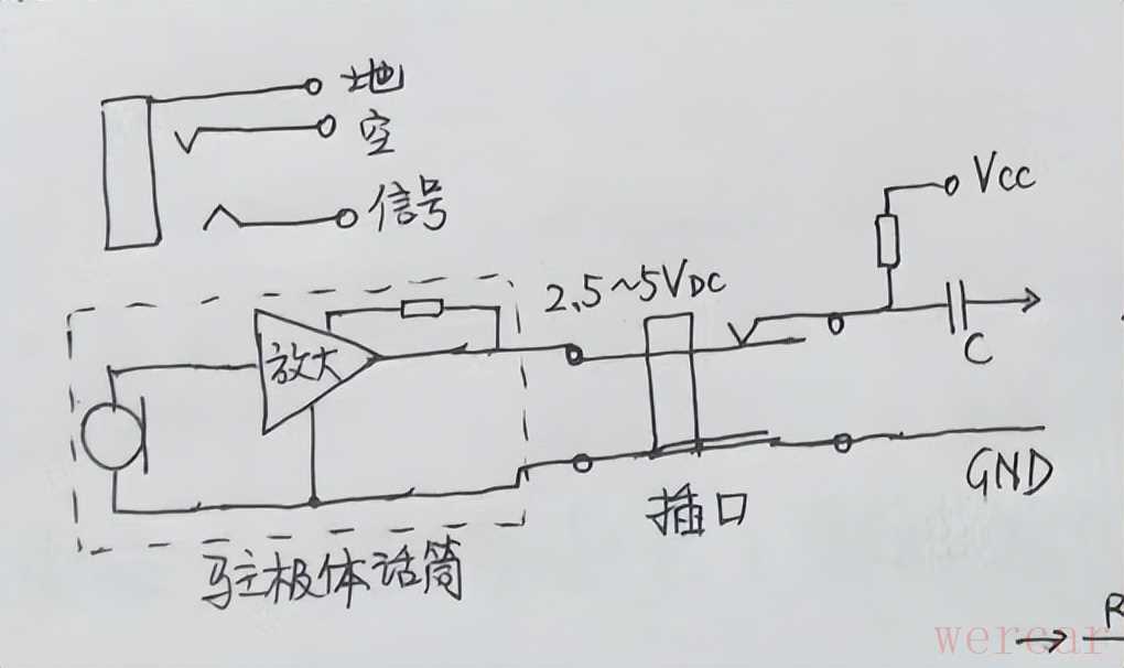 供电方式:通过偏置电阻(2.2kΩ~10kΩ,常见 4.7kΩ)串联到信号线,只给麦供电、不干扰音频信号