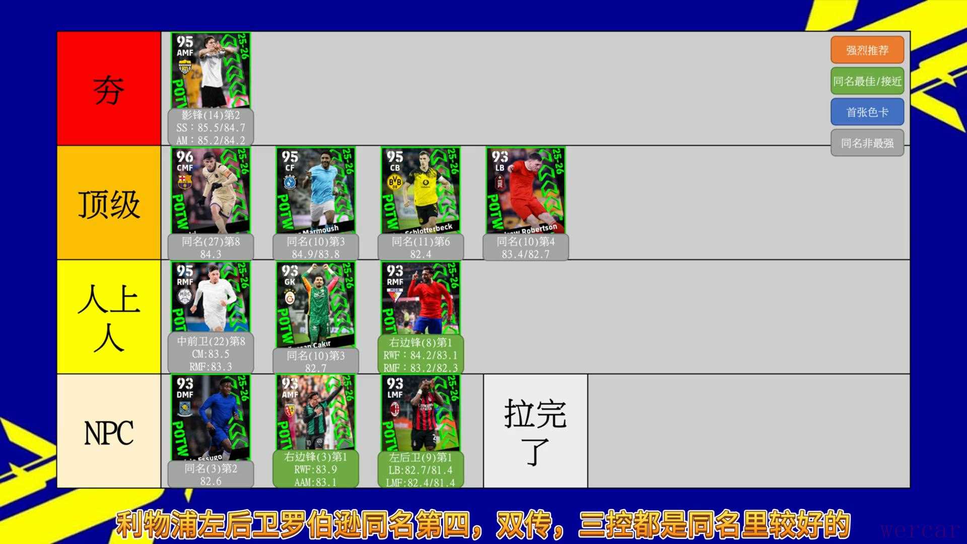 利物浦左后卫罗伯逊同名第四,双传、三控都是同名里较好的,技能新增了外部弧线球和远射。阿尔维德同名第八,同名里加速和身体平衡属性最强,技能新增向后切球并转身。作为中前卫,四防不足,双传也不好,作为边前卫,双速不够,综合评分不佳,所以评级没有给到顶级。