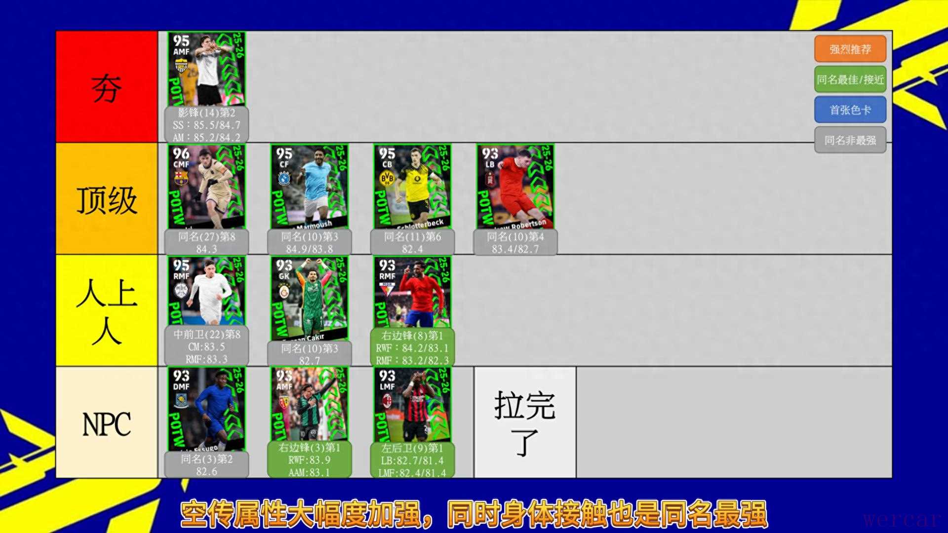 佩德里同名中上等,加速和身体接触同名最强,新增了队长技能,44脚也一直是中前卫上重要的节拍器。马尔穆什同名第三,三控和双传在同名里都不错。中卫施洛特贝克同名不算好,但是基本评分还是优秀的,同时拥有大模型优势。