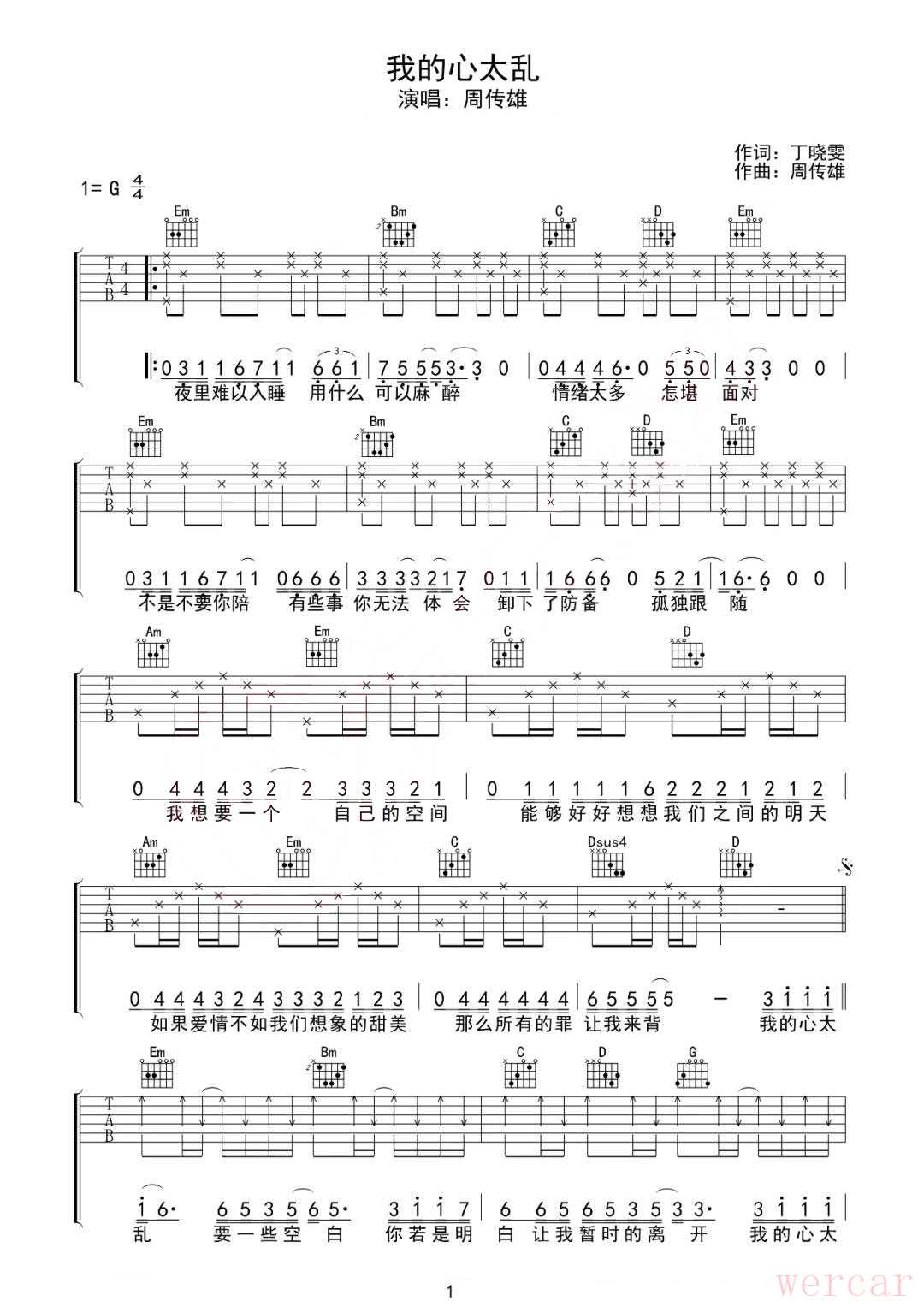 周传雄经典情歌我的心太乱吉他谱,弹奏浪漫旋