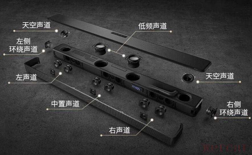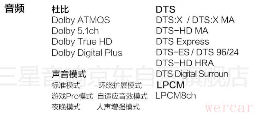 在音频解码上,其支持音频格式有:Dolby、 Dolby Digital Plus 、Truehd、Atmos、DTS-HD HRA, DTS-HD MA, DTS Express, DTS 5.1ch, DTS:X、LPMC 7.1、杜比MAT(Atmos音乐),算是全解码通吃的一条回音壁。在1.2W这个价位,其除了不具备HDMI2.1接口外,其他都要比三星Q990D好一些,非常适合不玩游戏的玩家。