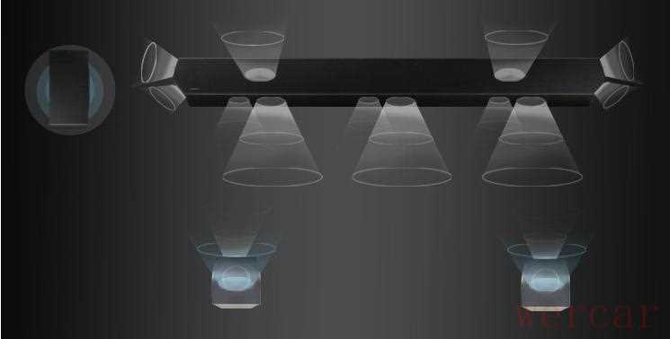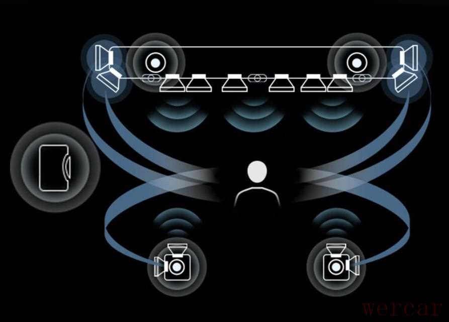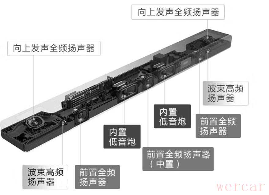 左右中6个全频单元+2个声束单元+1个低音炮+2个后环绕