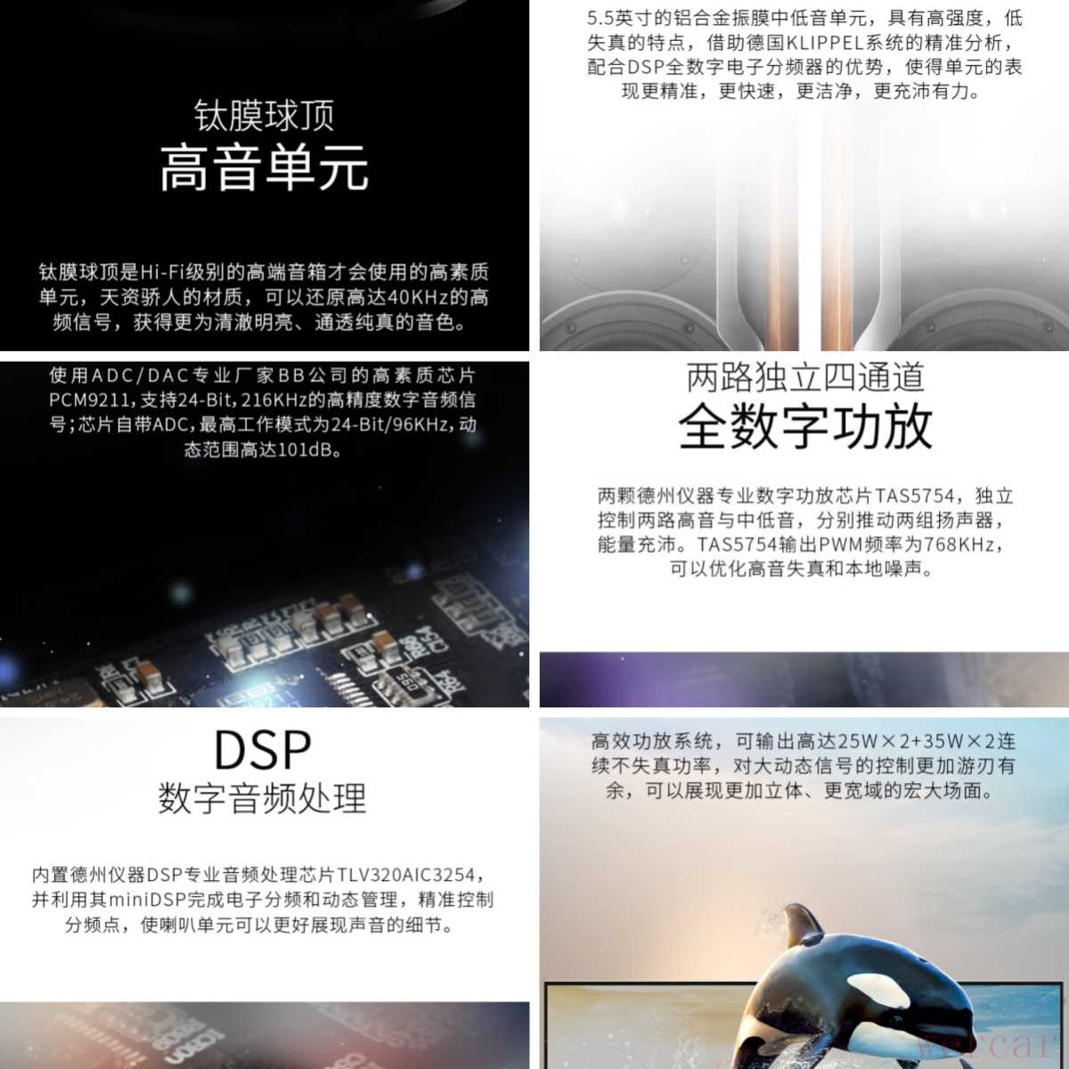 左、右各一对丝绢膜球顶高音单元和跑道型中低音单元