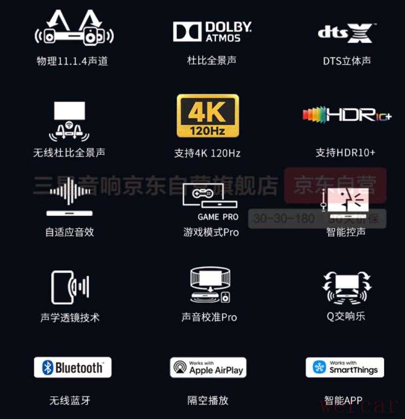 三星Q930C我愿称其为4000元价位的中端最强回音壁产品。如果你的价位在这里,想要最好的音效,那么Q930C是你唯一的选择。Q930C可实现物理的9.1.4声道音效,其共有17个扬声器单元,其中包含了9个水平声道1个重低音声道以及4个天空音声道,低音炮尺寸为8寸。支持音频格式有:Dolby、 Dolby Digital Plus 、Truehd、Atmos、DTS-HD HRA, DTS-HD MA, DTS Express, DTS 5.1ch, DTS:X、LPMC 7.1、杜比MAT(Atmos音乐),基本上全覆盖,这个配置基本属于回音壁中的平价天花板。在接口上,其仅提供了1进1出HDMI,带eARC,支持CEC,稍显不足。另外还有光纤接口。在无线连接上支持蓝牙、AirPlay和WIFI连接。