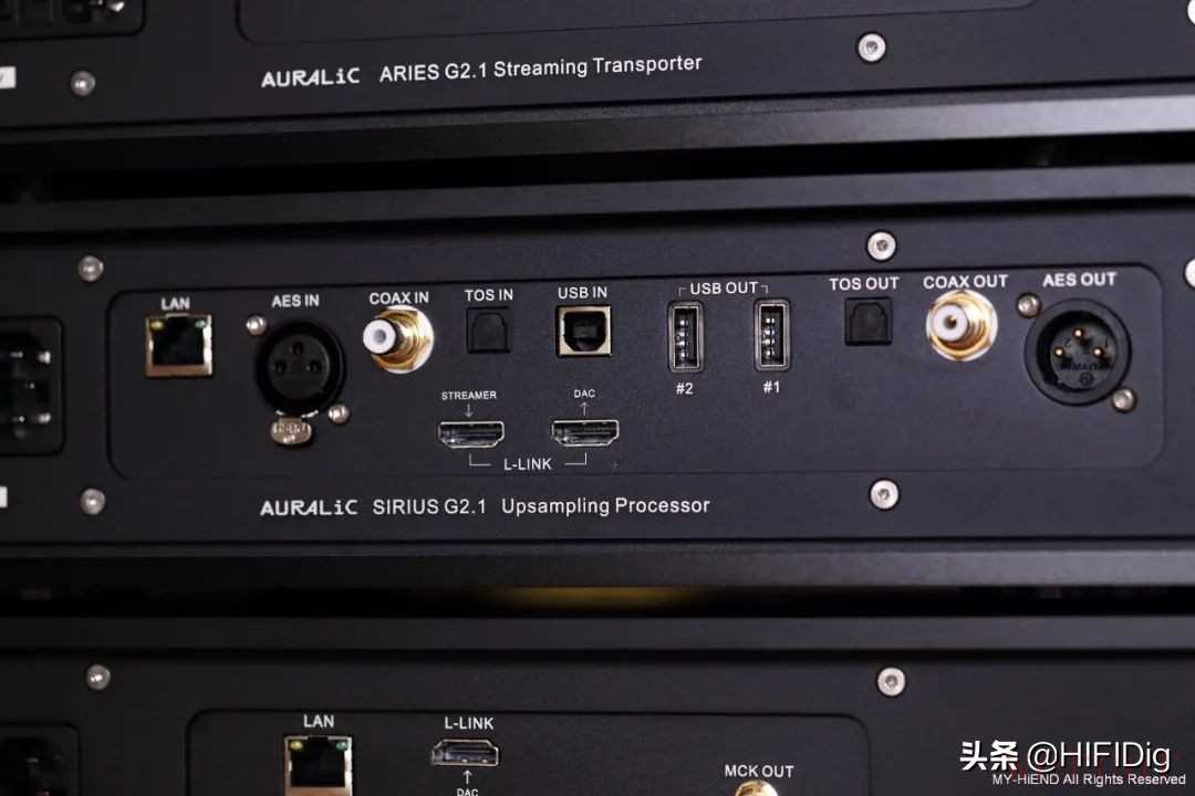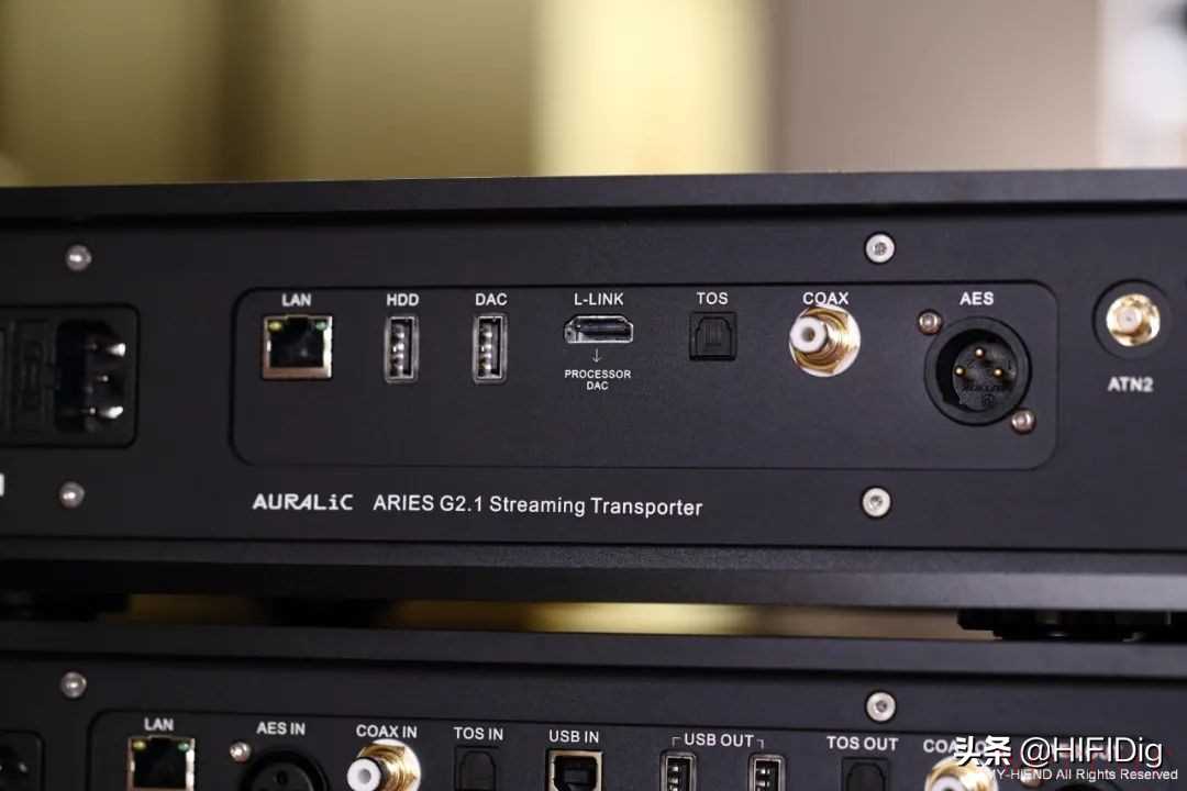背面可以看到每部器材的连接端子,当使用Auralic的器材时可以选择自家的Lightning Link彼此连接,这是双向通讯的HDMI连接,器材间借此沟通与传输讯号,也达到控制连动的效果。如果是搭配其他器材使用,基本每部器材都提供了丰富且常见的连接方式,USB、同轴、光纤、AES/EBU等。