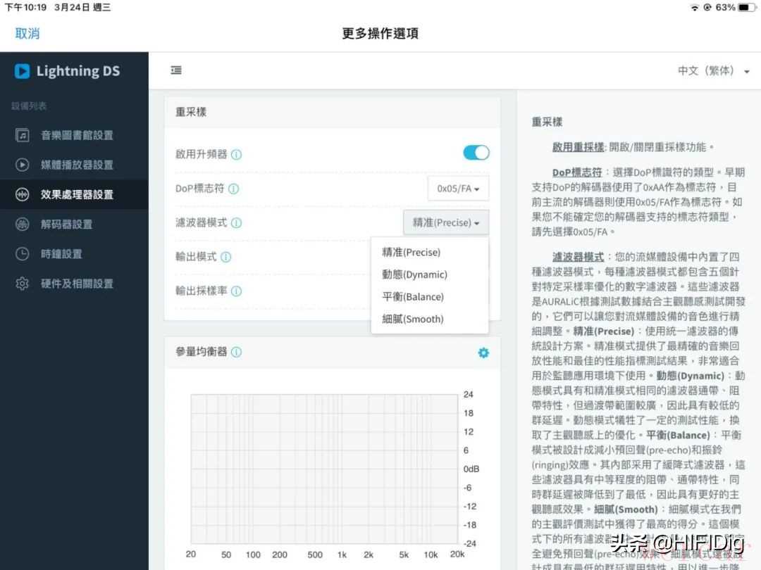 Sirius G2.1的工作方式是会将所有讯号来源都直接升频,然后依照用家选择重新取样输出给后端,无论原始档案是MP3、Flac或DSD,也不论取样率多少,用家都可以选择转换为44.1kHz/48kHz的1倍、2倍、4倍与8倍频率输出,也能选择DSD64、128、256、512的频率输出。而且用家可以统一将输入讯号都转换为同一种取样率输出,也可以独立设定不同取样率来源各自转换为不同取样率输出,非常弹性,当然用家也可以随时关闭升频处理器去比较声音的差异。Sirius G2.1的所有操作都能透过前面板执行,也能更方便的使用自家开发的Lighting DS app操作,这个app不仅是播歌软体也是Auralic所有器材的管理与设定软体,不只Sirius G2.1 、就连Aries G2.1、Leo GX.1主时钟与Vega G2.1数位类比转换器的所有功能都能在此切换。