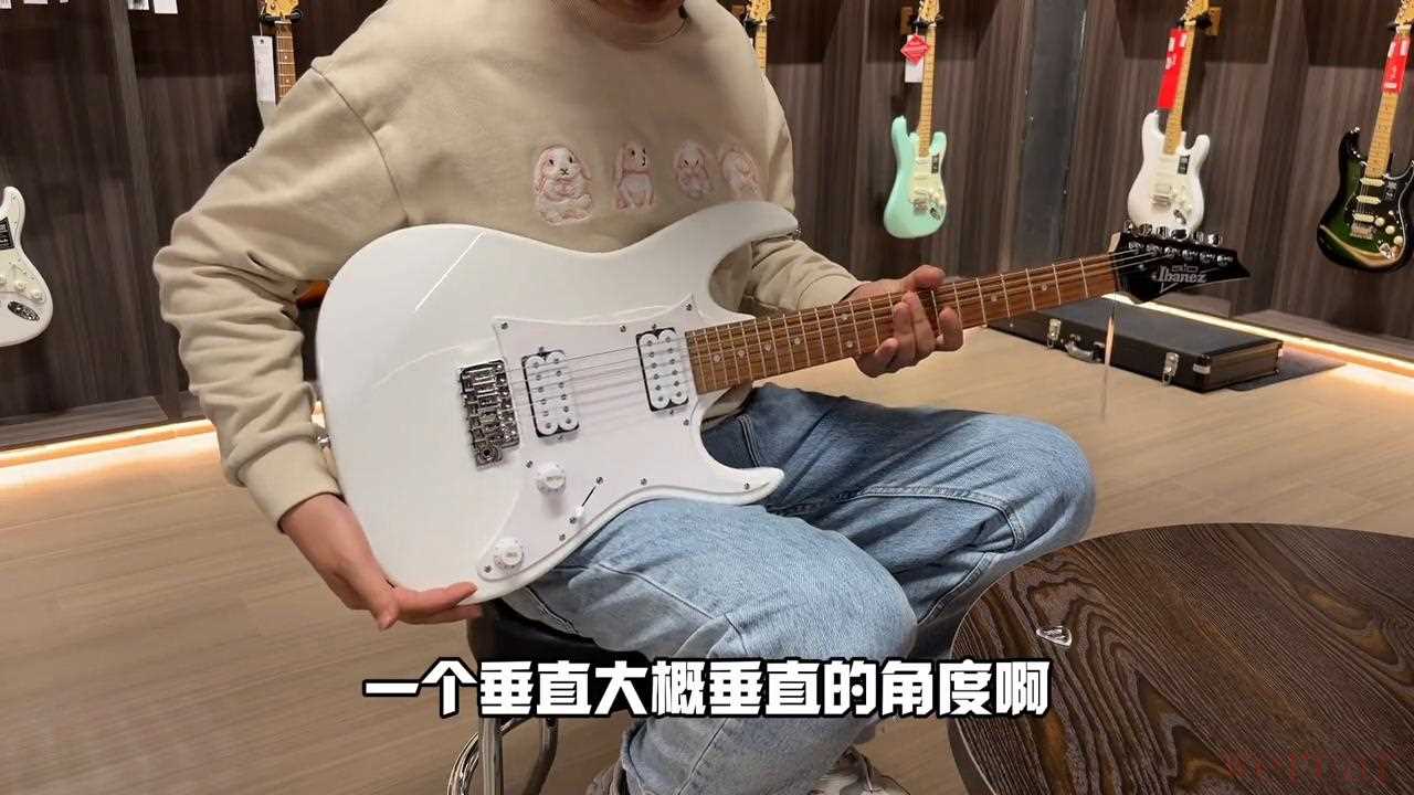 ·拿到这样的一把电吉他之后可以看到它的下方有一个弯曲,把弯曲的地方放在右腿上,这是一个正常的坐姿的抱琴的方式。尽量的不要这样太倾斜,一个大概垂直的角度放在身体上。