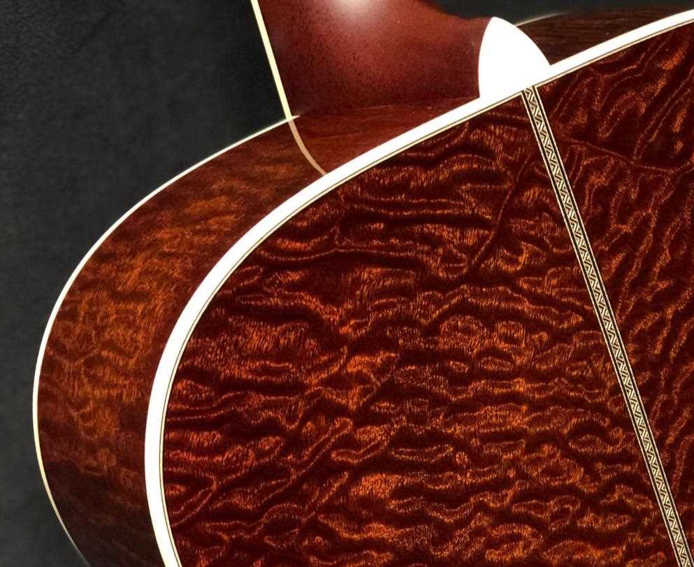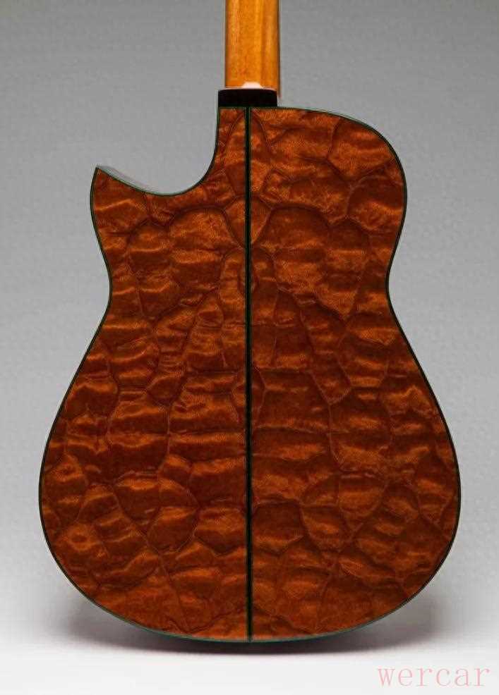 而老朋友沙比利Sapele(Entandrophragma cylindricum)外观与力学性能都接近桃花芯,且能出大板材。不过,沙比利更重、更深、更容易有华丽花纹(pommele、ribbon stripe),但因为交错纹更强,加工更难。这也是为什么现在很多高级品牌或者独立制琴师愿意去找一些非常特别的沙比利做客制,如果你愿意抛下一些偏见,其实非常容易订到很特殊纹理的背侧。