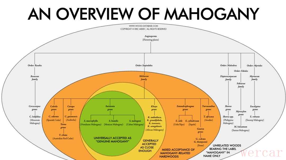 其实也很简单,把市面上常见的桃花芯分为三大类:首先是以Swietenia 属(真正的“Genuine Mahogany”)为主导,其次是以Khaya 属非桃花芯但常被挪用做“非洲桃花芯木”)的楝科(Meliaceae)亲戚,最后则是同属楝科的其他“类桃花芯“材料。必须强调:在最严格的标准里,Swietenia 属才算“真正桃花芯木”。下面列举几种最为常见并且比较好的例子。