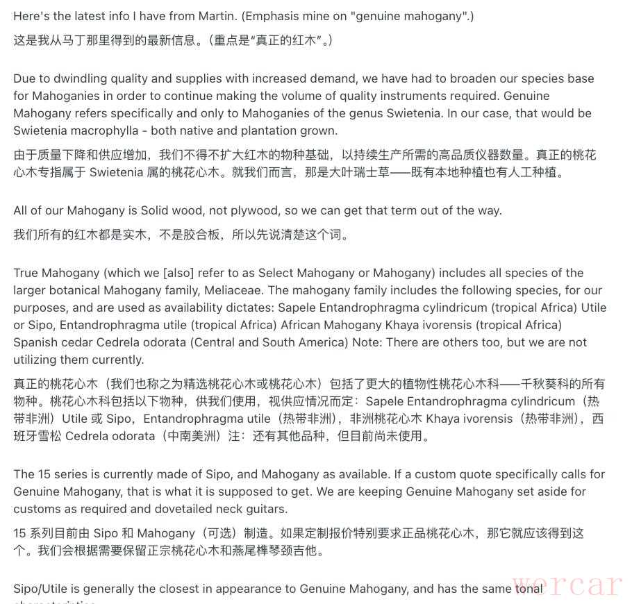 如果你有很仔细的研究过桃花芯目前的运用,你就知道其实“非洲桃花芯“其实不是桃花芯,但是99.9%的厂在当成桃花芯用。当然这也不是一件坏事,因为很多制琴师对这种材料的声学性能非常推崇。其实如果你再仔细一点,或者直接和马丁这样的大厂订过Custom Shop,你会发现他们会直接告诉你,如果你不明确要求“Genuine Mahogany”你拿到的基本就不会是Swietenia属的桃花芯,而是来自Sapele Entandrophragma cylindricum(热带非洲)Utile 或 Sipo,Entandrophragma utile(热带非洲),非洲桃花心木 Khaya ivorensis(热带非洲),西班牙雪松 Cedrela odorata(中南美洲)……具体你能用上什么,取决于当时的供应库存情况。