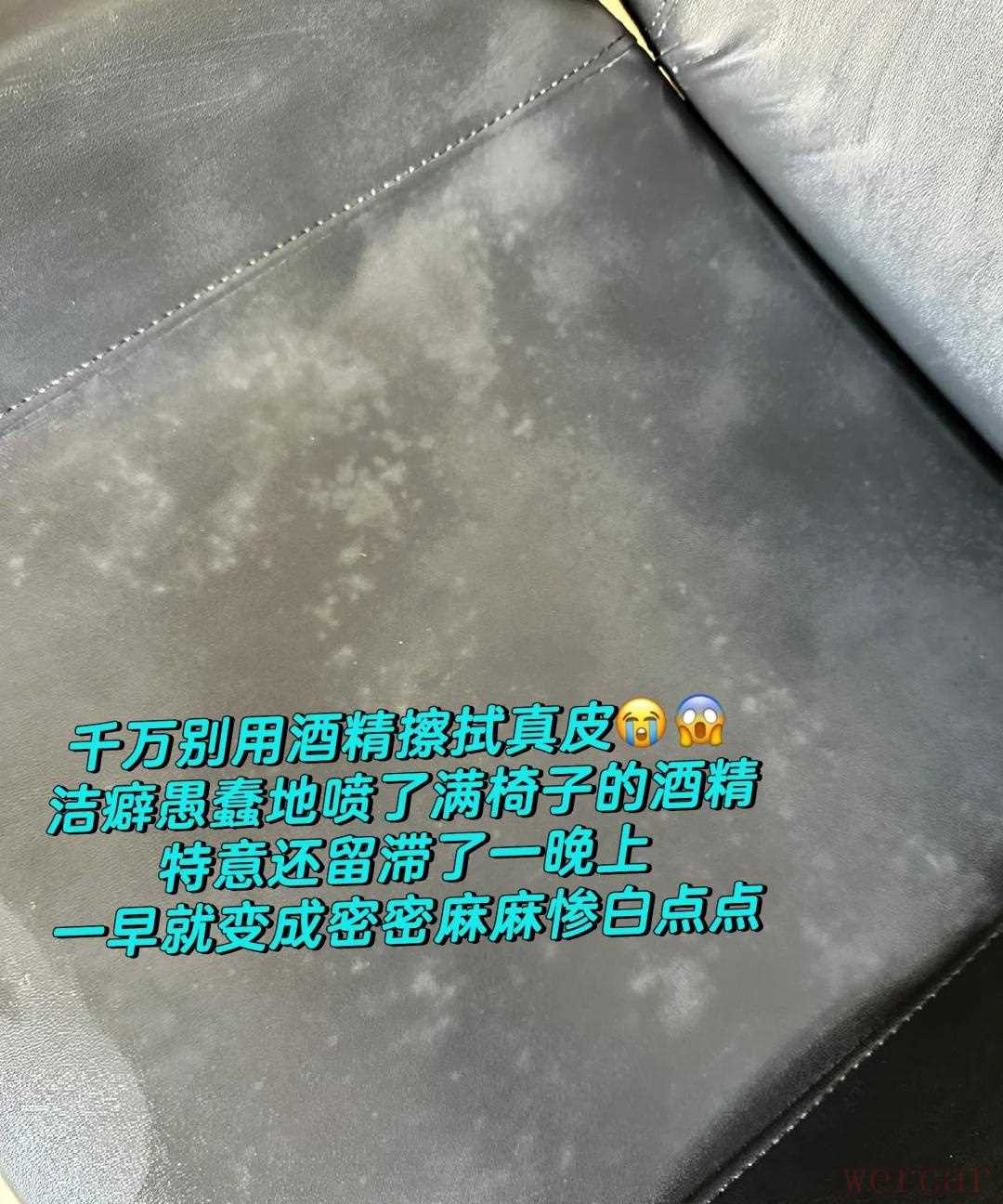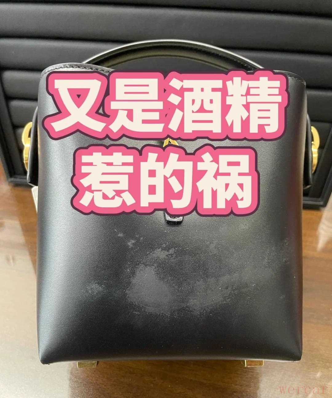 真皮制品更娇贵,酒精会把皮面的油脂层给抽干,干皱、掉色都是轻的,几千块的包擦完直接变旧货摊同款。