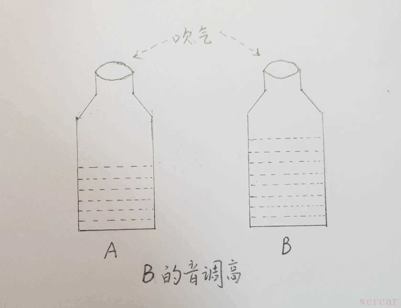 ④瓶子里装水,用嘴吹瓶口,瓶子里的空气振动,空气柱越短(水越多),频率越快,音调越高。