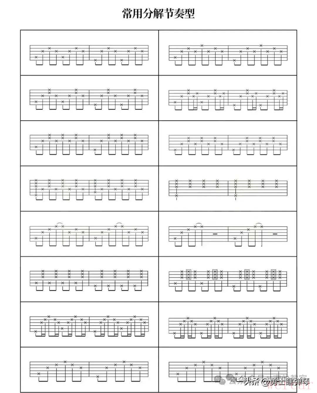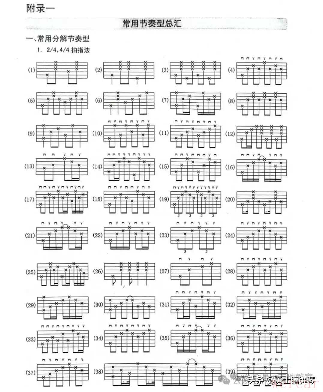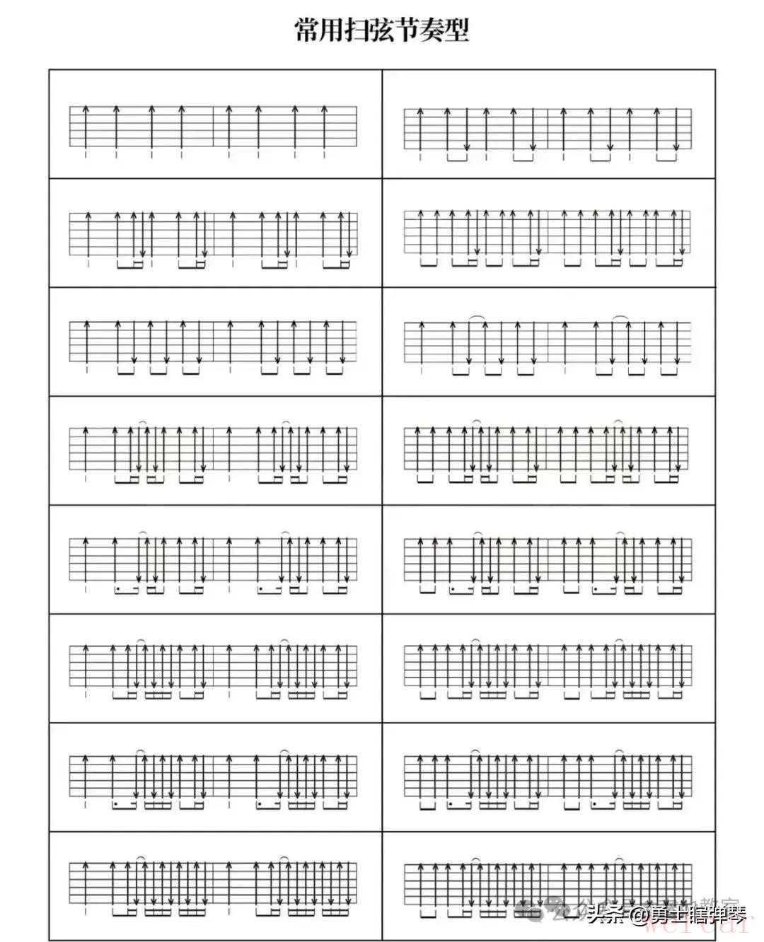 - (图:常用扫弦节奏型与分解节奏型总汇图表)