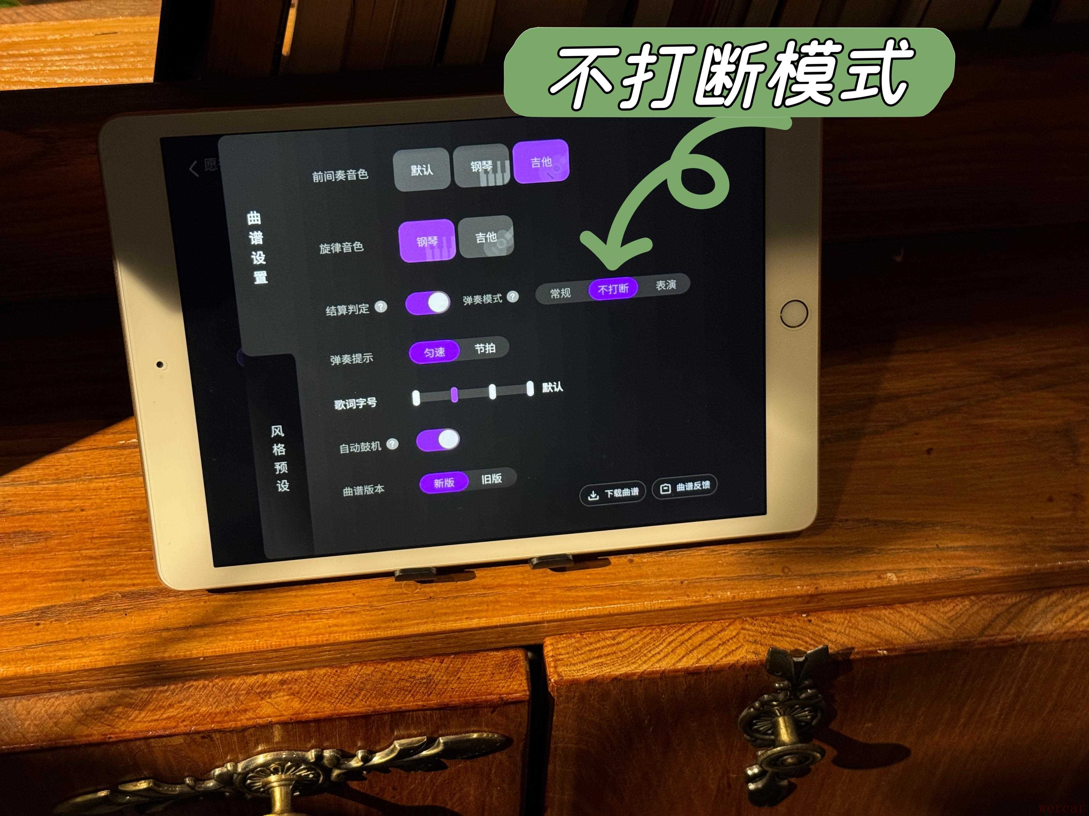 而且我在聚会上用这吉他来弹奏时,也不用担心弹错的问题,它有个不打断功能,只要开启了,就算我按错了品,音乐也不会断,大家照样可以开开心心地唱下去,我这个“暖场主理人”也就不会因为弹错卡壳而尴尬了。