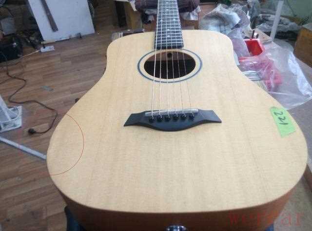 另一方面包边则对琴体边缘起了保护作用,这边不是指磕碰,而是弹琴时吉他边缘会经常与手臂发声摩擦,久而久之,无包边的面板边缘可能就会慢慢被磨损,甚至可以看到透光。因此,我们一定程度上还是更支持选择包边的吉他。(图片为我们修理的一把旅行吉他,面板处就是因为久弹而被磨损了一小块。)
