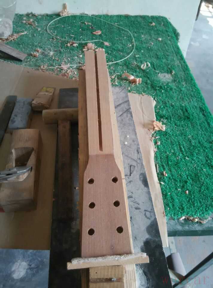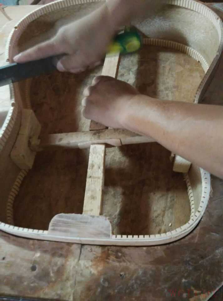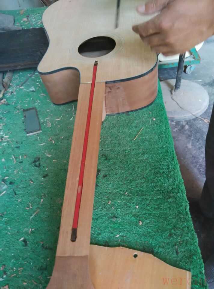 仔细看的话应该就能看出,木片是贴合在包边边缘,用于稳定板材之间的牢固度。吉他的侧板十分薄,拿在手中有种拿着A4纸张的感觉。如图所示,想让各个板面可以较好的贴合稳定,木片也是必不可少的哦。