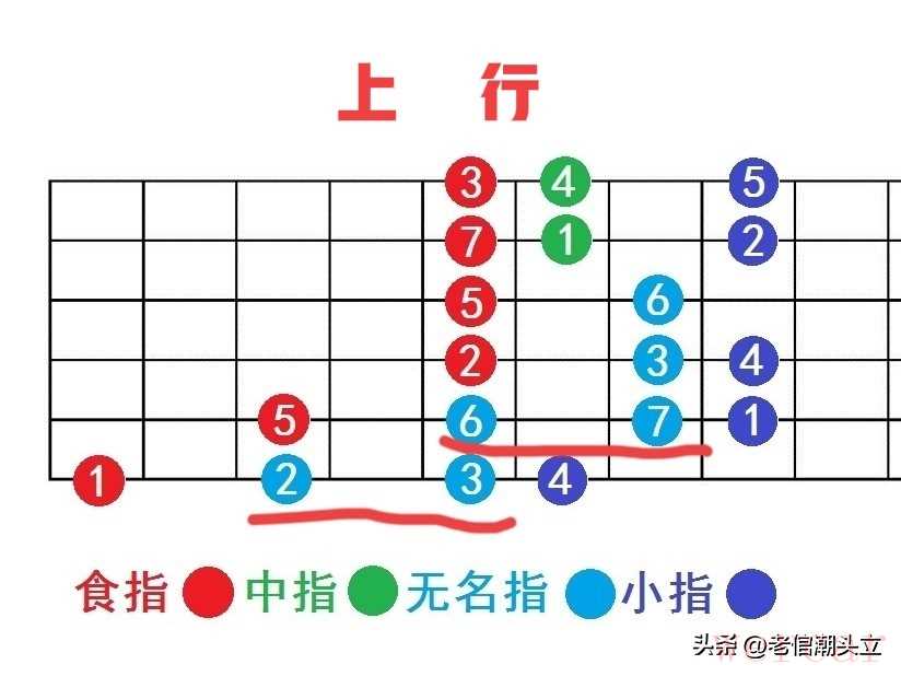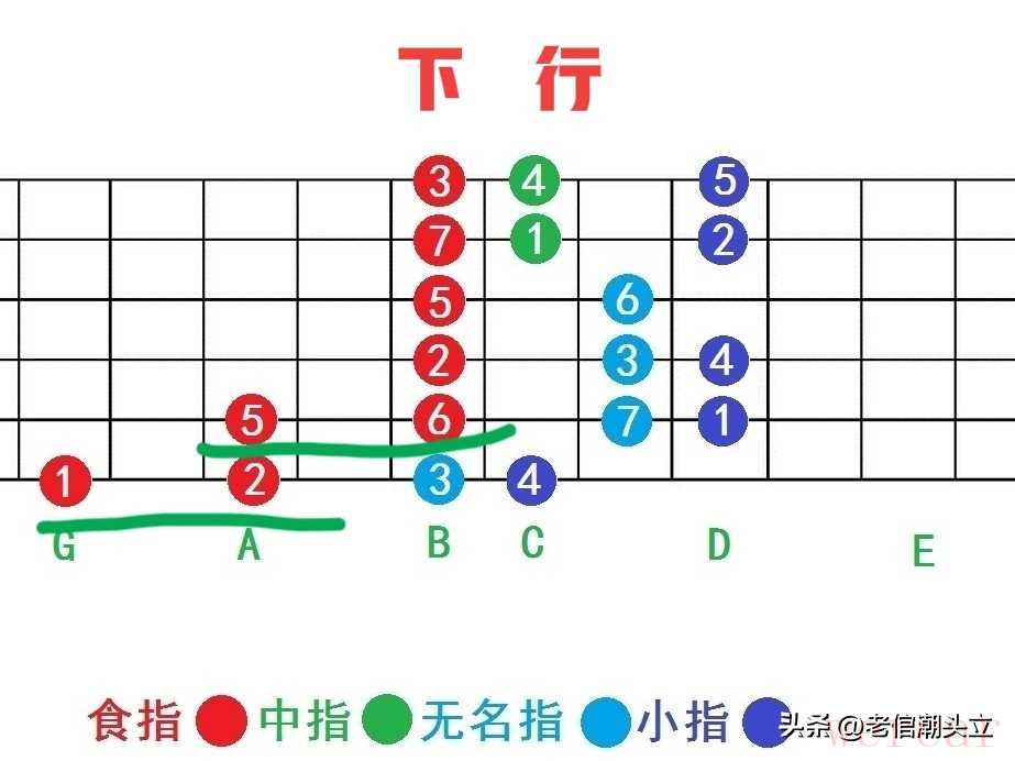 上行:从5671234567123456412,当弹到六弦及四弦6音的时候,无名指从6音滑到7音(快速滑的动作);