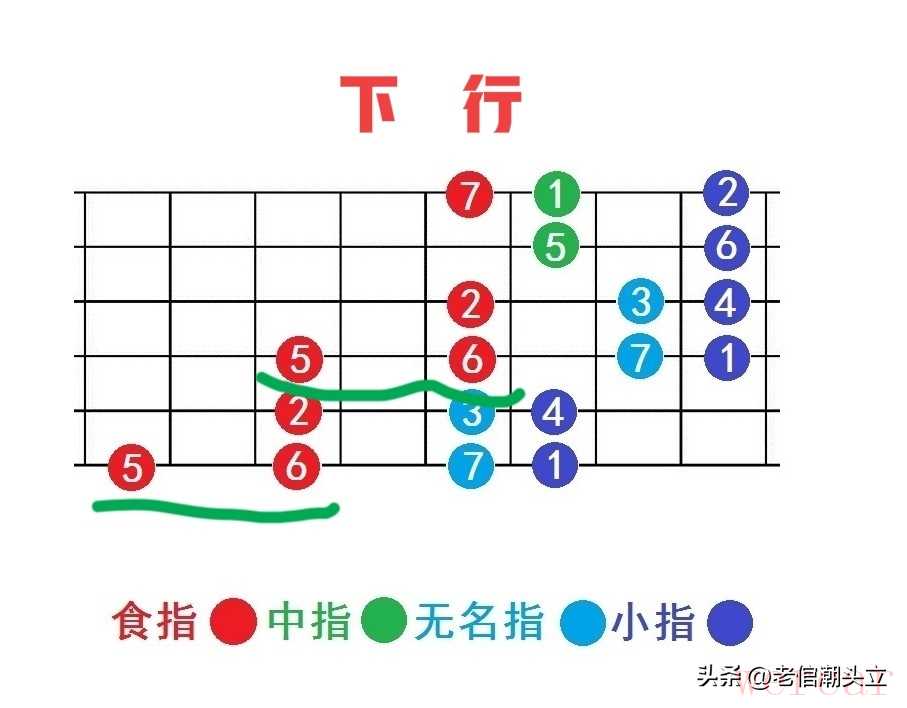 下行:从217654顺序弹,梁弹到6音的时候,食指从6音滑到5音。