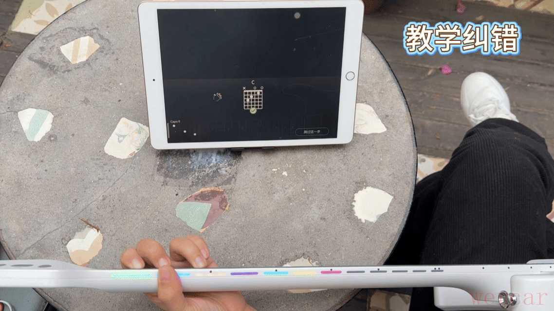 这系统课和普通网上视频课很不同的一点在于,它有实时纠错,当你手指放在吉他琴弦上的时候,屏幕上是会联动显示的,这个时候如果你按错和弦了,就会有提醒,可以马上调整过来。我平时测评家电手还挺灵活的,到了练吉他的时候,就不太行了,总是按错,得亏有这教学纠错功能兜底,不然我早就不知道学跑偏到哪里去了。