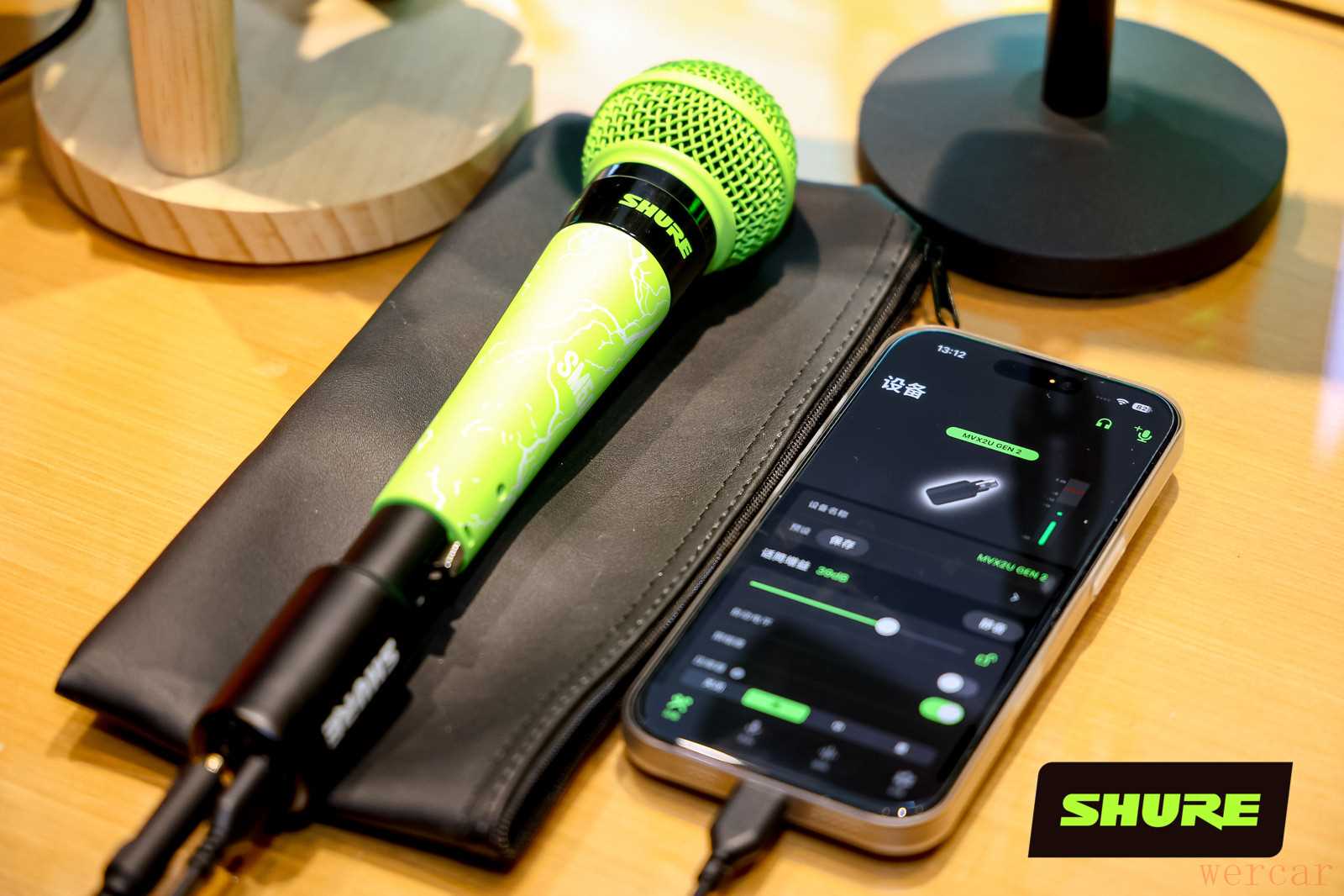 舒尔麦克风与手机 · 绿黑配色舒尔麦克风旁,手机显示设备设置界面