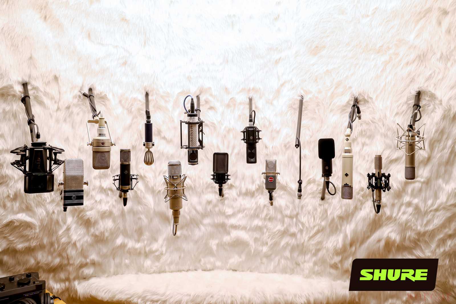 多款专业麦克风 · 多款不同样式的麦克风挂在毛绒背景墙上