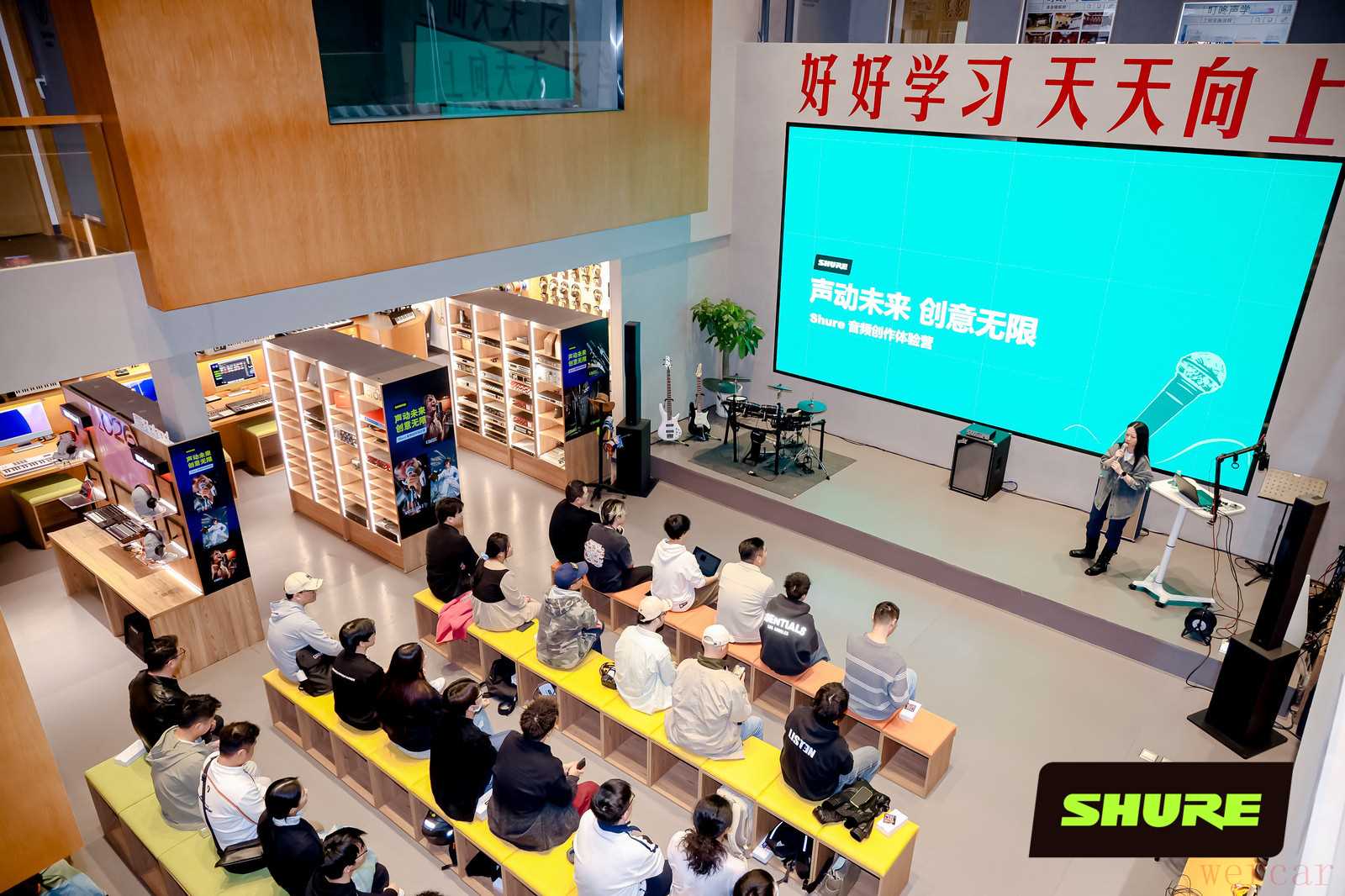 舒尔音频创作体验营活动现场 · 大屏幕显示活动主题,台下坐满听众