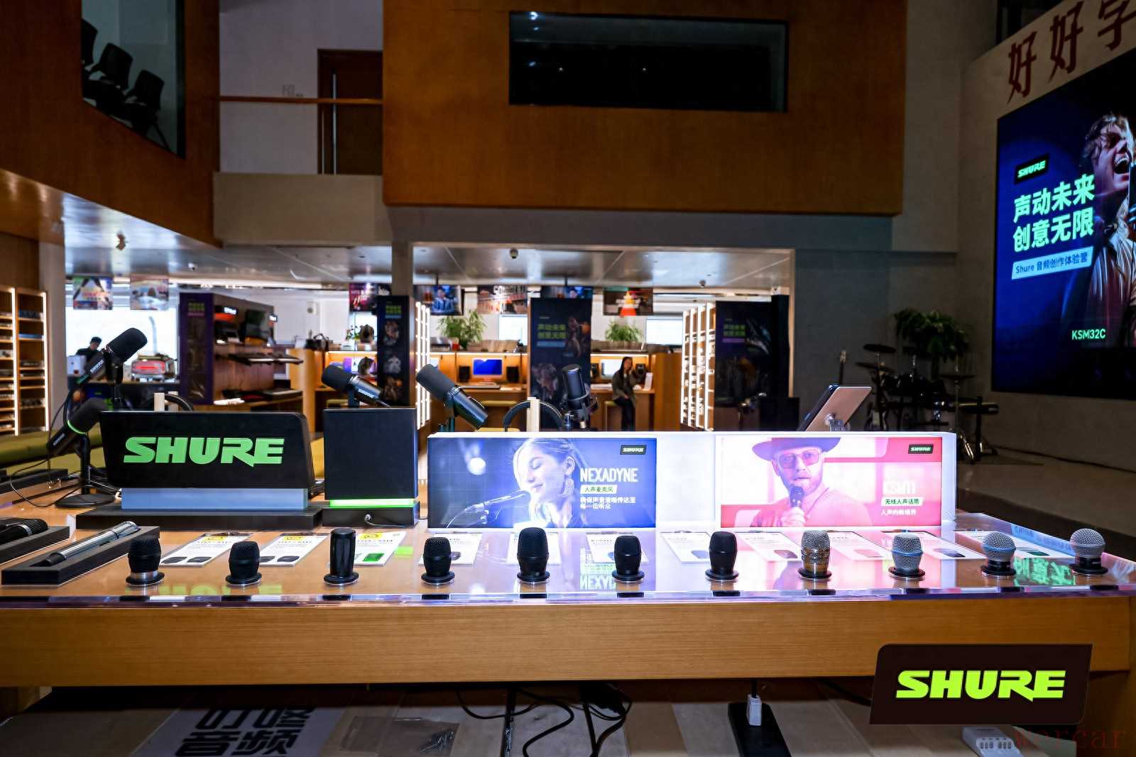 舒尔音频设备展示台 · 展示台上陈列多款舒尔麦克风及宣传牌