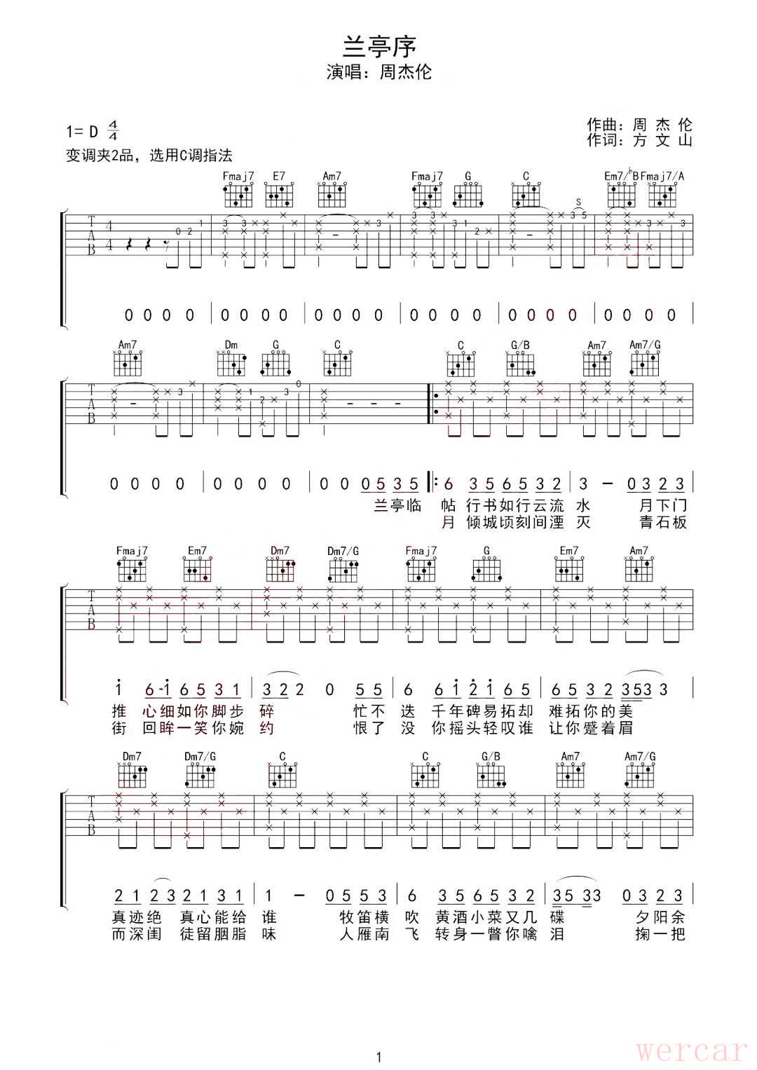 同学们可以对照谱子和音频来演奏,原调D调,本谱采用C调指法,变调夹夹2品,以下是周杰伦的《兰亭序》音频欣赏: