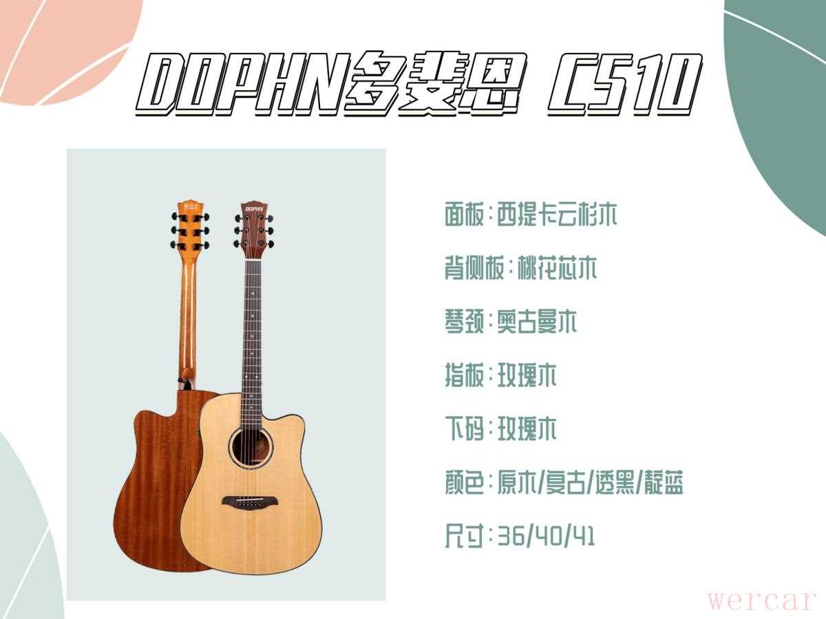 第二个是DOPHN C510,这是一个国产品牌的吉他,曾经和校长去他们工厂参观过,生产流程什么给人的感觉很正规,老板说这些都是以前按照外方的要求设置的,质量和进口品牌比其实大致一样。这款C510是面单吉他,西提卡云杉木,桃花芯背侧板,在声音方面我们也做过对比,它的音色完全不比进口品牌2000左右的差,确实非常值得初学者入手。
