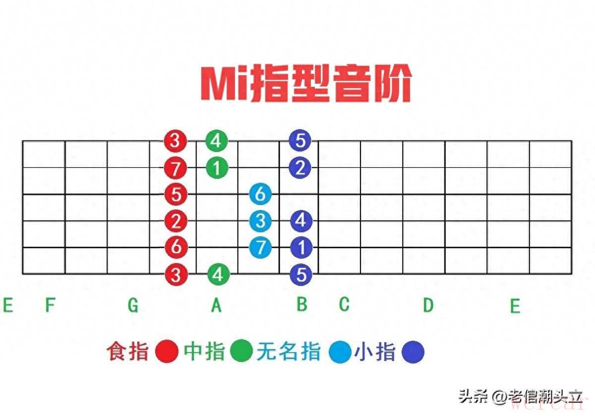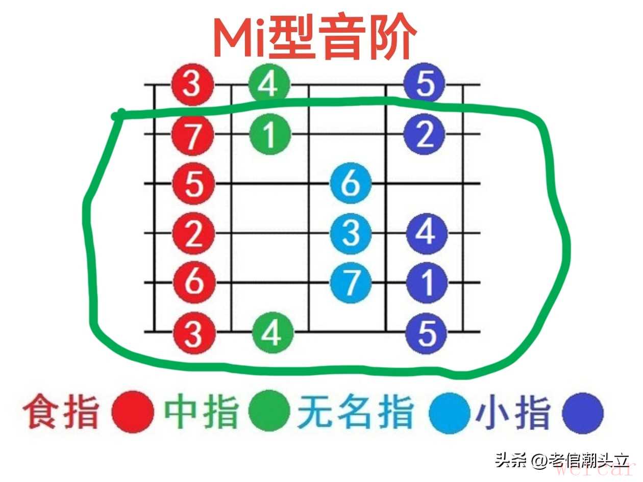 Mi指型就是吉他音阶的总钥匙,它的指法框架是固定的,根本不用重新记新指法,只要找准起始音位置,直接平移就能切换指型。比如把Mi指型从六弦平移到五弦,就成了Si指型,指法形状几乎一模一样,上手极快。