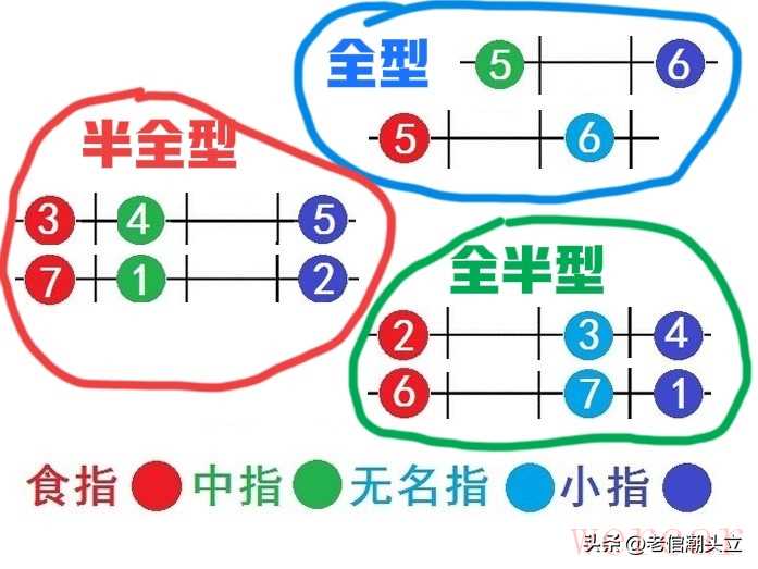 等真正吃透Mi指型,五种指型自然一通百通,不用死记硬背,十二个调都能随意切换,弹唱、独奏都能得心应手。其实指型音阶的核心在下面这张图里,全半型指法、半全型指法、全型指法,五种指型音阶就是这三种指法,堆出来的积木。