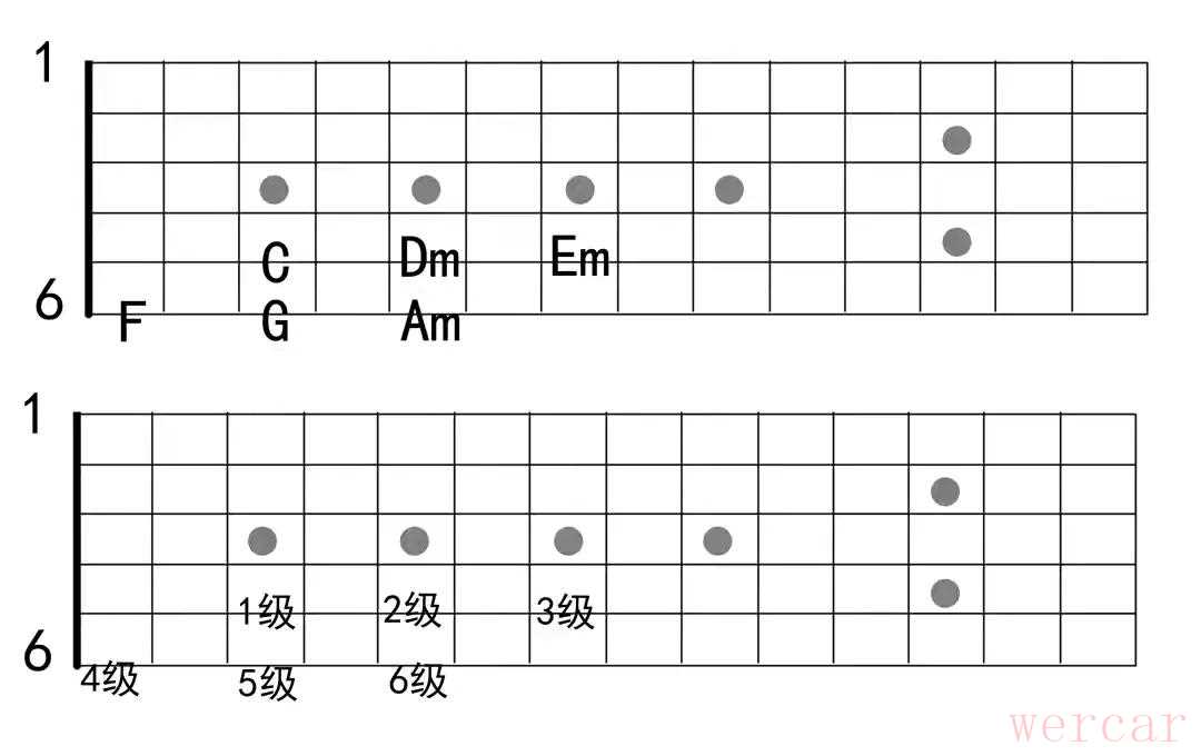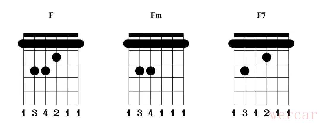 BCDE调的一二三级和弦的根音都建立在第5弦上,用♭B和弦指型,扫弦时注意把食指的指尖轻触在第六弦上把音闷住。四五六级和弦的根音建立在第6弦上,用F和弦指型。