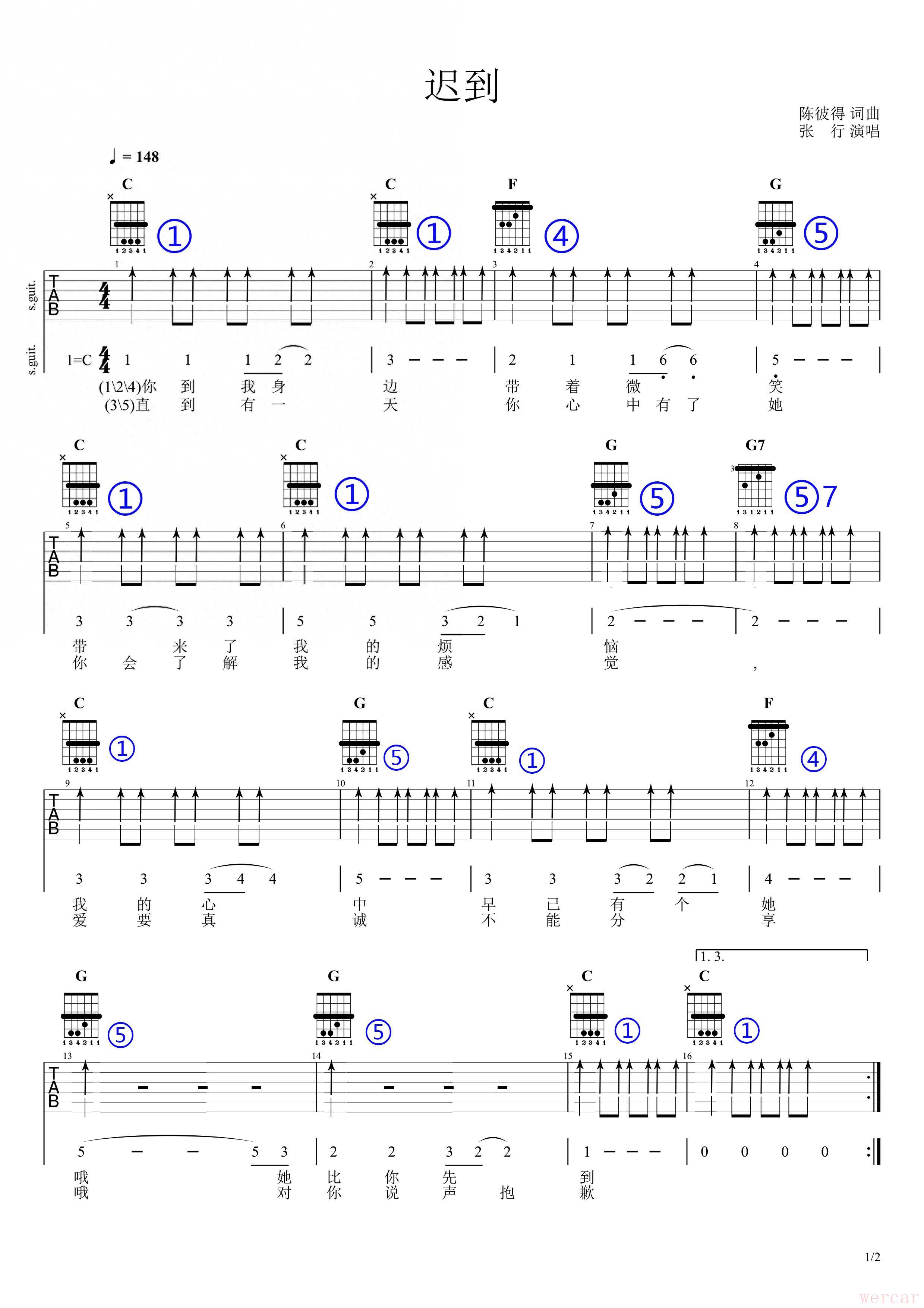 (1)歌谱用C调编制,和弦指法图右侧的蓝色带圈数字,是和弦的级数。