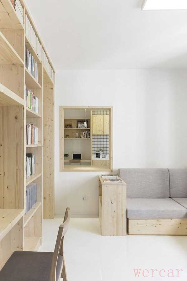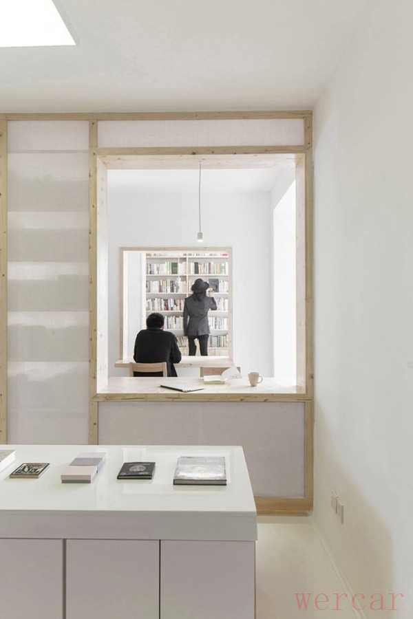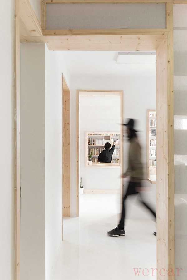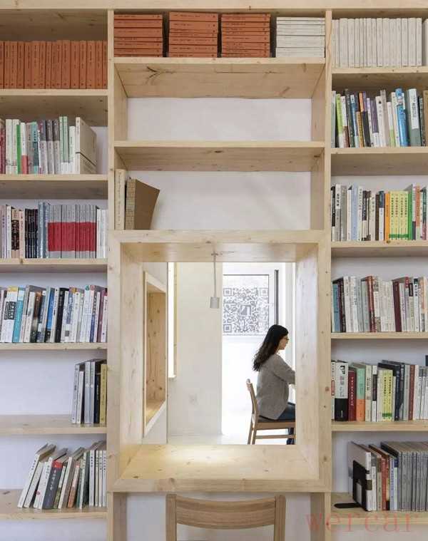 因此曹璞的设计围绕改善采光条件进行。他的设计理念是,当顾客走进书店后,从每一个角度都能看到光,所以凿通了许多墙面。把屋里坚固的各面隔墙上开几个洞口,让光线和视线可以彼此透过。于是,类似于“凿壁偷光”,被分割的空间便连成一个整体。